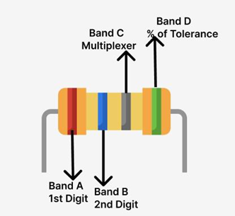 Der Wert eines Widerstands kann anhand der auf seinem Gehäuse aufgedruckten Farbstreifen bestimmt werden.Ein Standard-Vierbandwiderstand hat für jedes Farbband eine spezifische Bedeutung.Das erste Band stellt die erste Ziffer des Widerstandswerts dar, das zweite Band stellt die zweite Ziffer dar, das dritte Band fungiert als Multiplikator, der bestimmt, wie viele Nullen auf die Ziffern folgen, und das vierte Band zeigt die Toleranz oder die zulässige Abweichung vom angegebenen Widerstand.